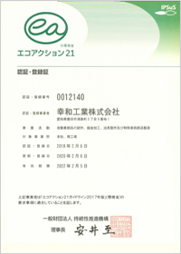 幸和工業は、2018年2月、環境マネジメントシステム「エコアクション21(※)」を認証取得いたしました。